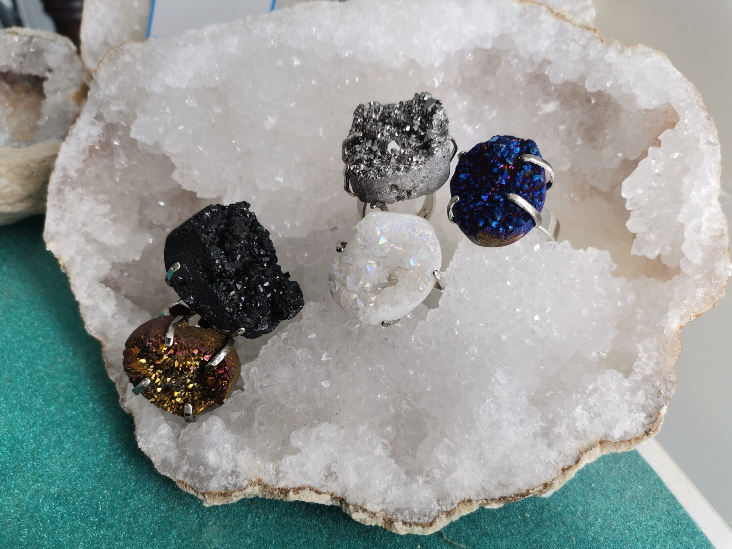 Anillo de drusa de mineral natural. Espectacular anillo de drusa sin pulir de Aqua Aura . La drusa de Aqua aura está engarzada por cuatro pestañas a su alrededor. Anillo de acero antialérgico. El anillo es adaptable por lo que no hay problema de tallaje.