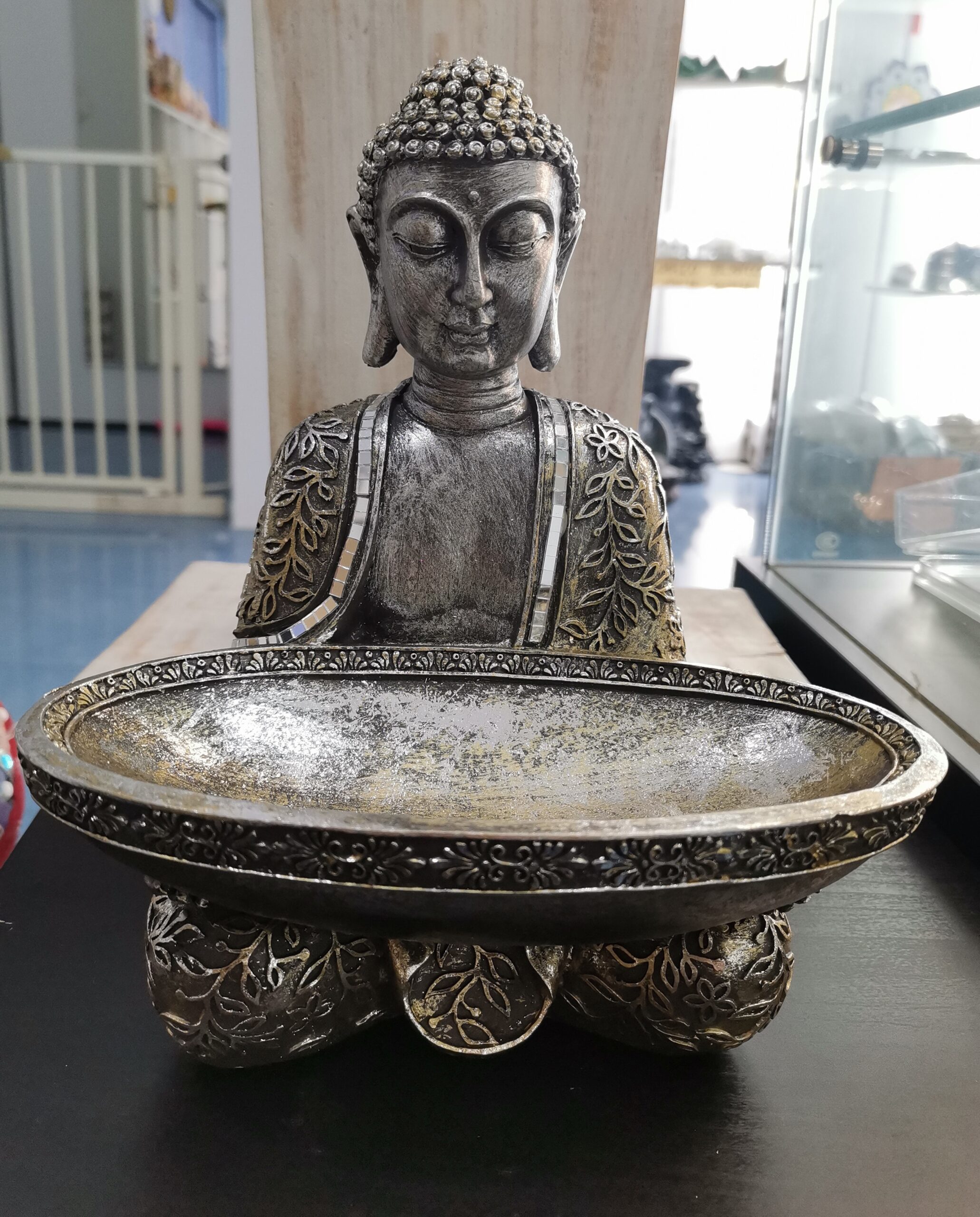 Espectacular figura de Budha en posición de meditación y en sus manos lleva un plato o bandeja para poner tus ofrendas, minerales u objetos personales. Fantástica terminación y detalles. Lleva unos espejos en su ropa.. Figura de decoración de resina. Tamaño 18 centímetros de altura, 22 centímetros de ancho y 13 centímetros de profundidad. Finos acabados.