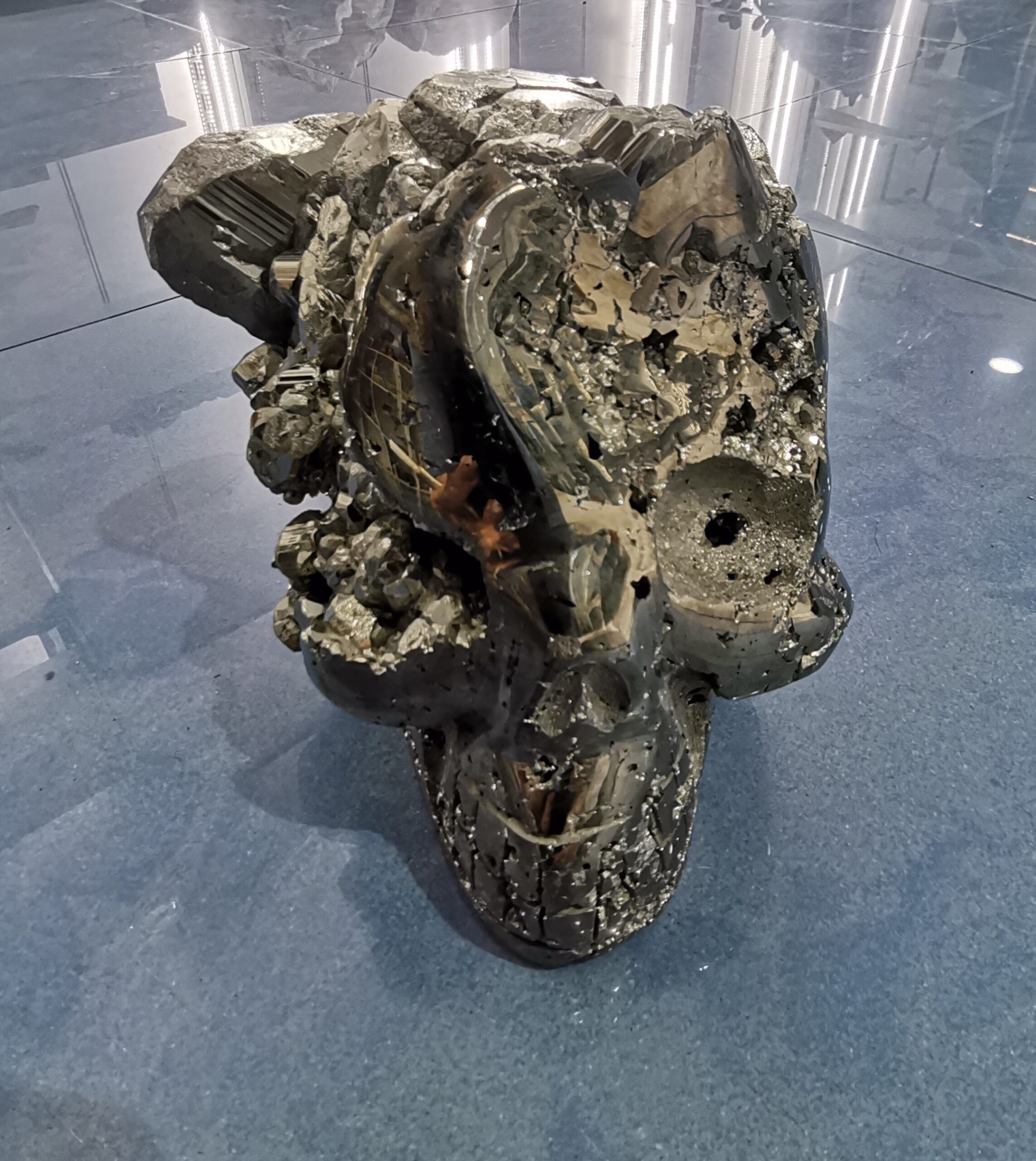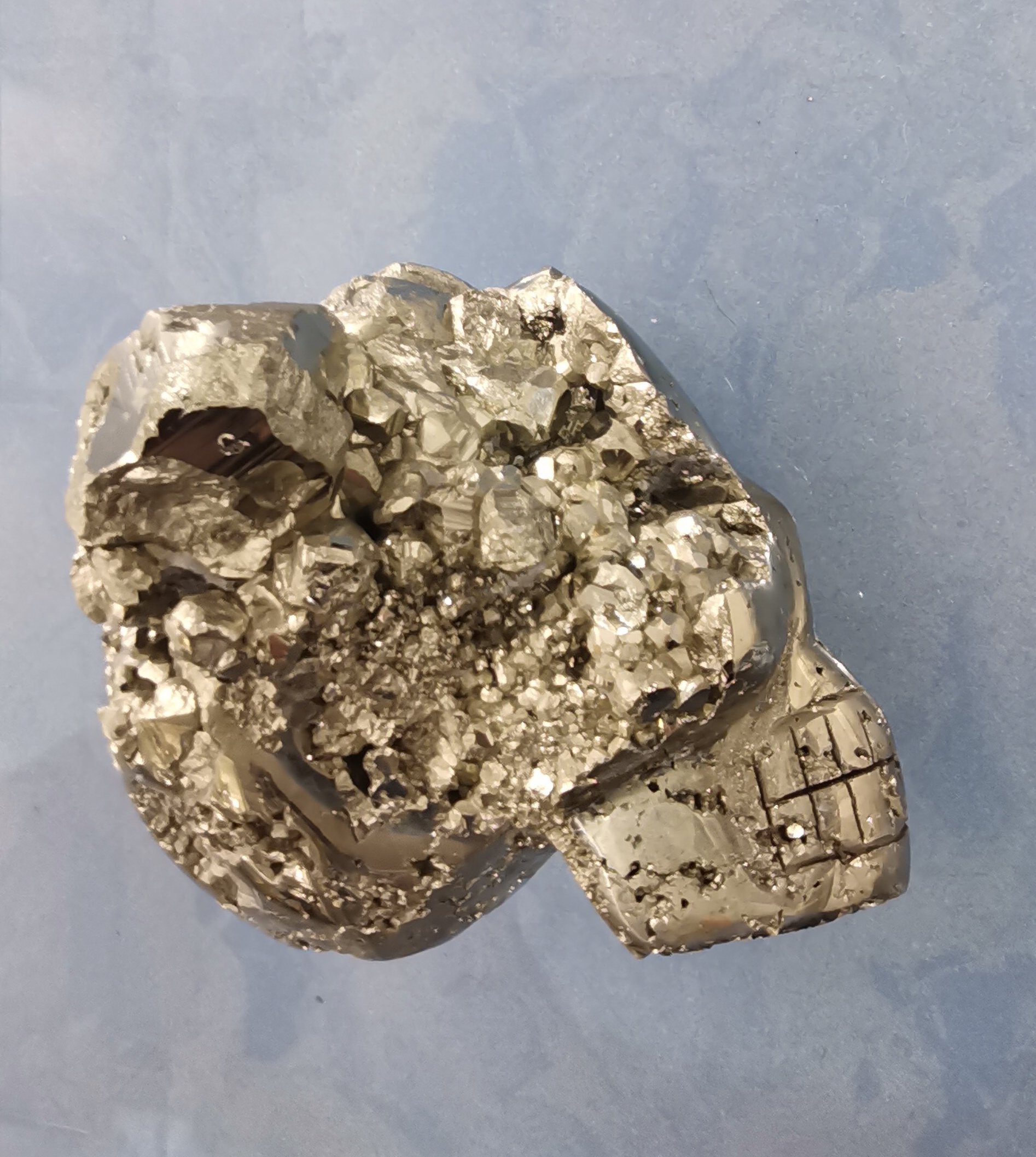 Drusa de Pirita semipulida en forma de calavera. Procedencia Perú. Posee certificado de autenticidad y procedencia. calidad extra. Peso 3884 gramos. Espectacular calavera de pirita de unos excelentes acabados. Pieza exclusiva. Pieza única.Esta pieza de mineral tiene un gasto de envío diferente. Se comunicará al realizar la reserva. Tamaño 11,50 centímetros de altura, 11 centímetros de ancho y 14,50 centímetros de profundidad.