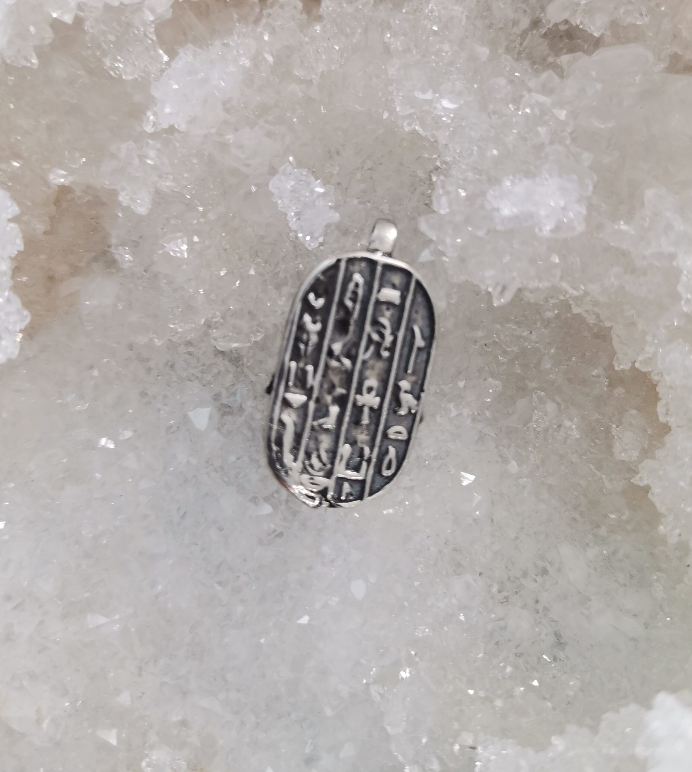 Colgante de Escarabajo egipcio en plata de ley. La totalidad de este colgante es de plata de ley. Este bello colgante tiene en su parte delantera un escarabajo egipcio y por la parte trasera lleva la tabla de Ra en signos . Simbología sagrada egipcia de protección y vida.  Tamaño 2 centímetros de largo por 1 centímetros de ancho.