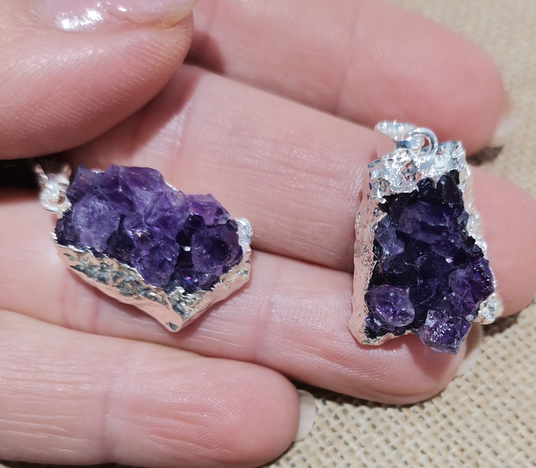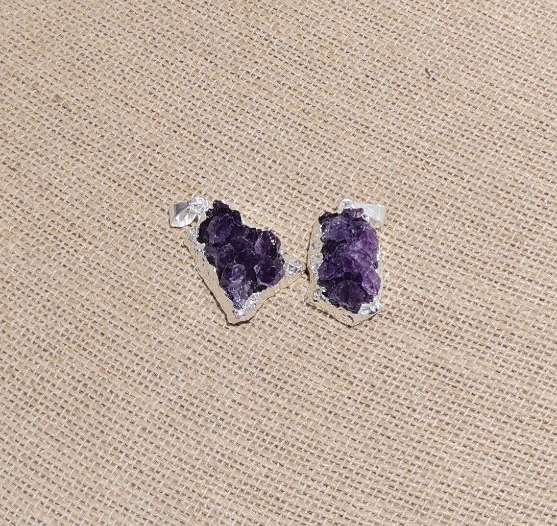 Colgante de Amatista . Colgante de mineral natural. Encontramos una Amatista de gran calidad y pureza en bruto, sin pulir ni manipular. Está anchada en electrolítico plata a su alrededor. Tamaño del colgante 3 centímetros. Tamaño del cabujón de Amatista 2,50 centímetros de largo por 1 centímetros de ancho.