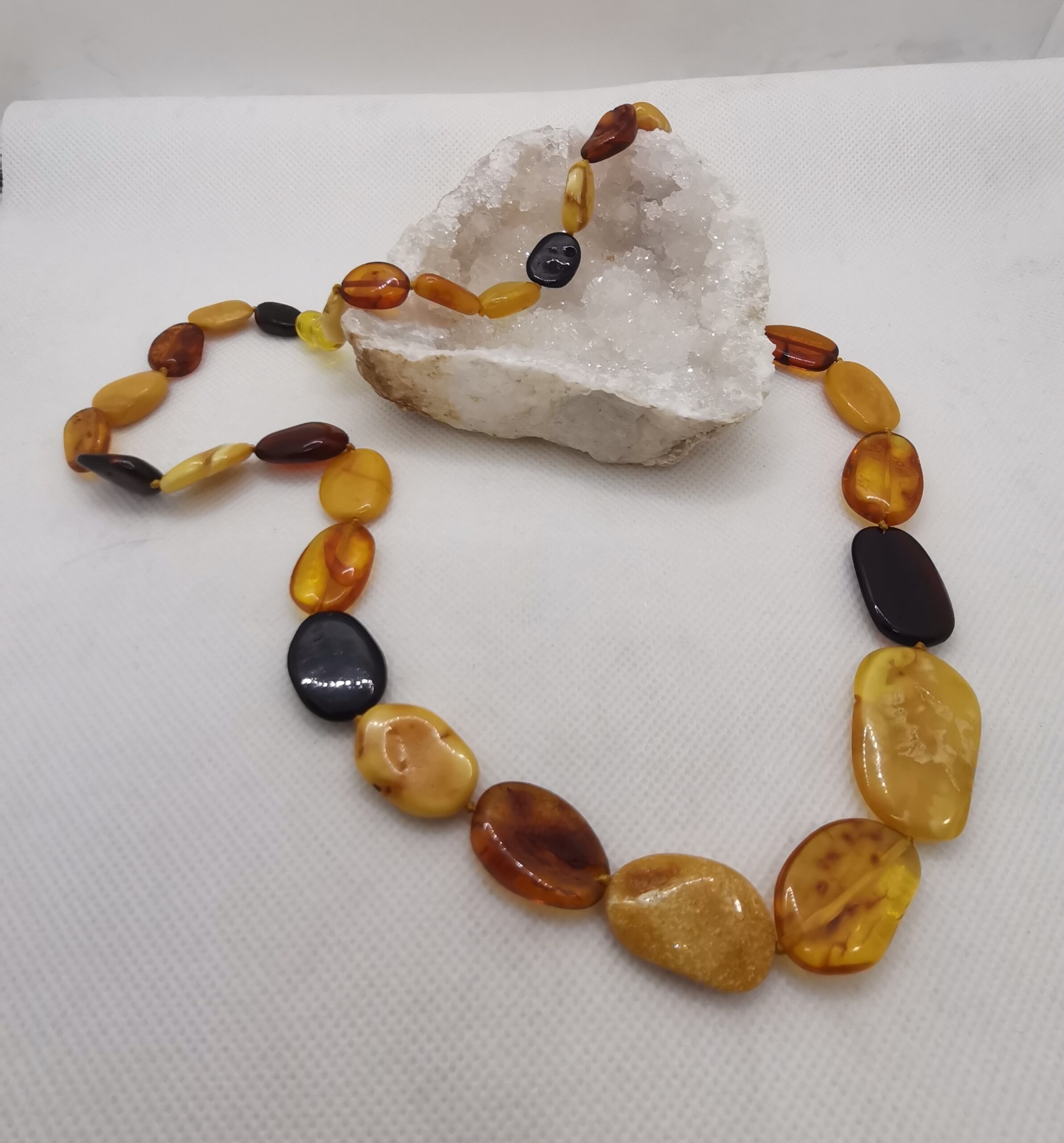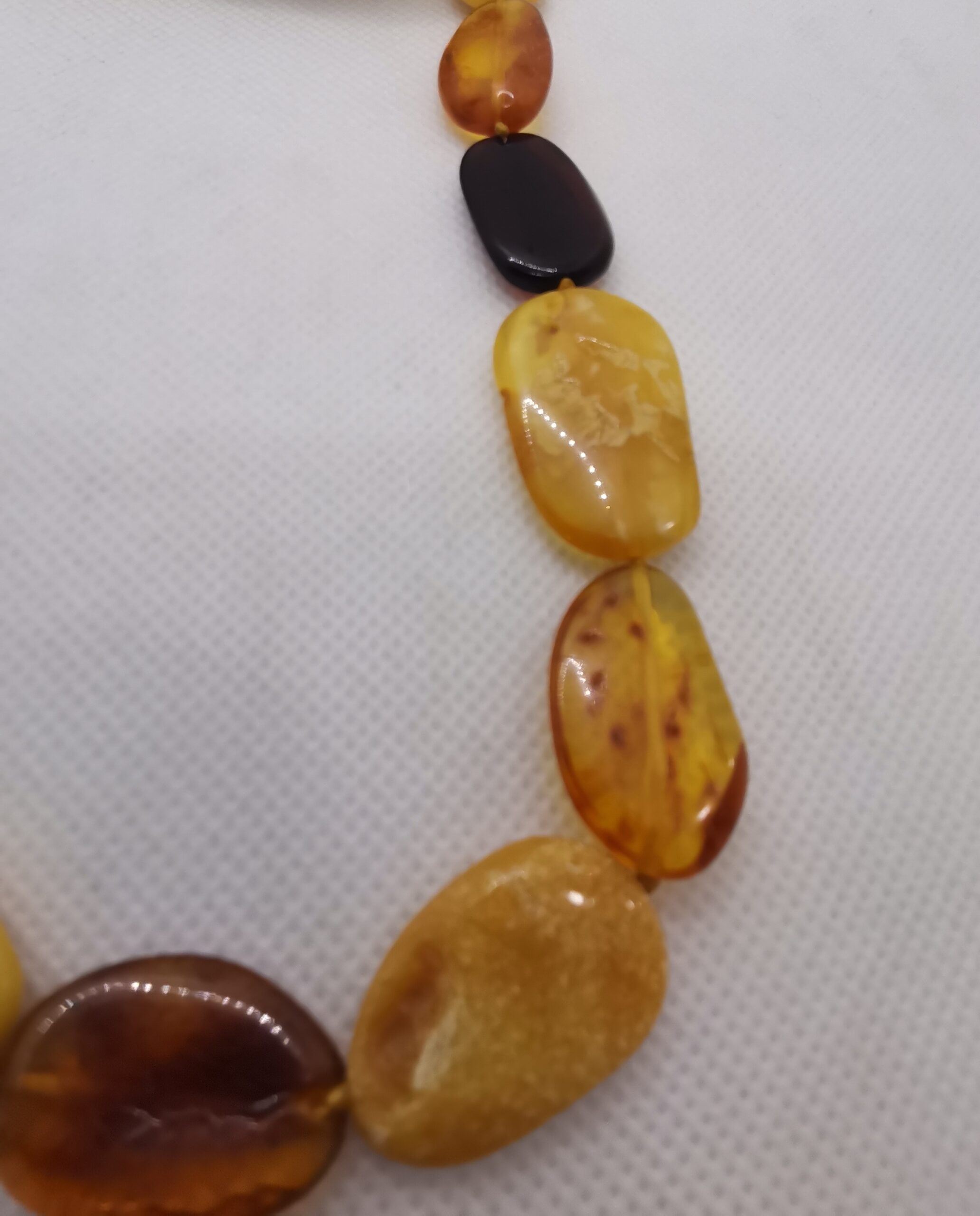 Collar de Ámbar mujer. Procedencia Mar Báltico. Estupendo collar de Ámbar auténtico. Longitud 62 centímetros. Cierre de seguridad de rosca camuflado. El collar tiene un diseño que mezcla de una manera elegante y armoniosa el Ámbar en cuatro tonalidades diferentes. El Ámbar está tallado en rodados planos que van en aumento de tamaño desde el cierre hasta el centro del mismo.