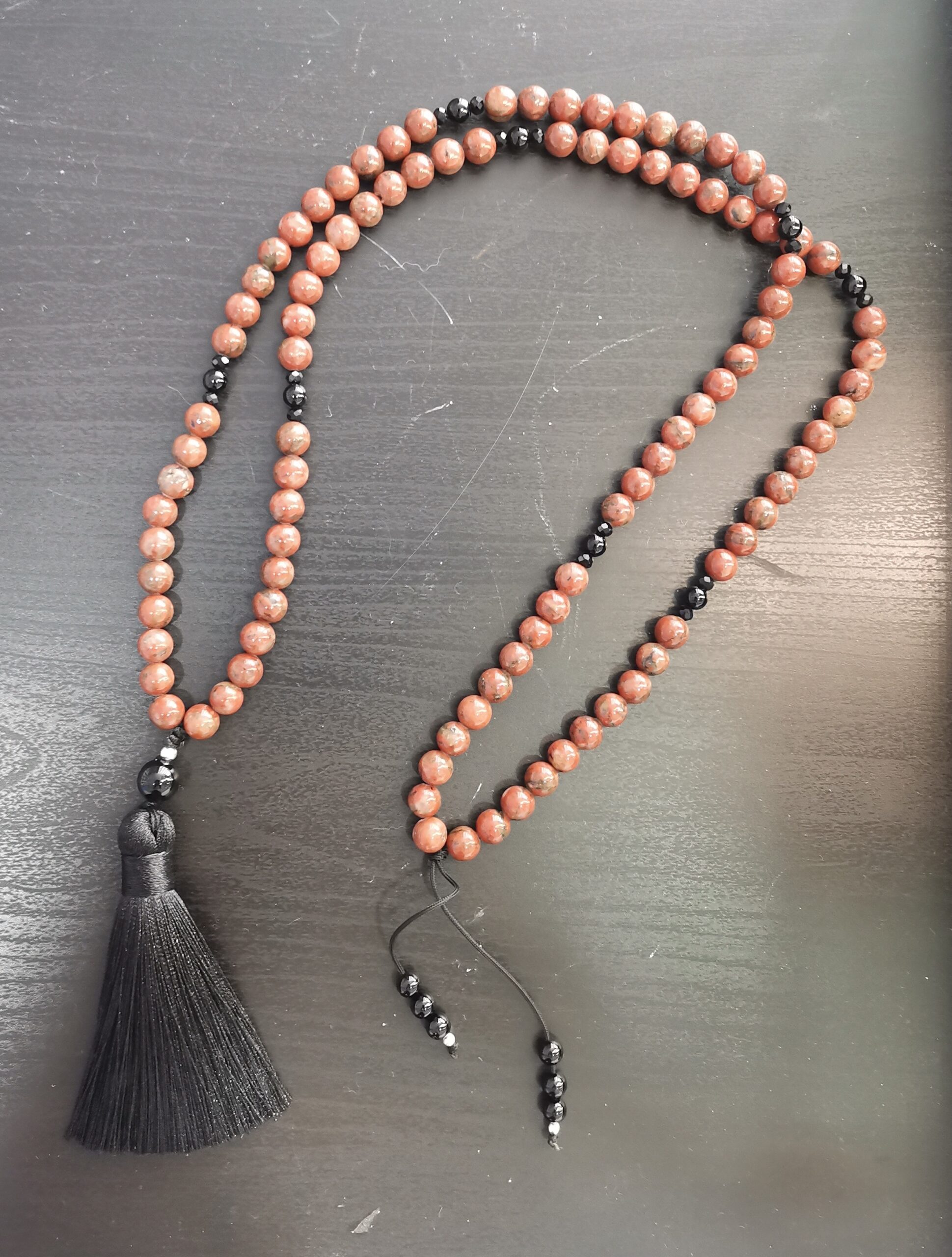Mala de mineral natural. Mala de 108 cuentas para meditación. Esta Japa Mala lleva una repetición de 10 bolas de Jaspe rojo de 8 milímetros y una bola de 6 milímetros de Onix negro. En las separaciones del mala encontramos bolas de plata de ley 925. Tiene un bordón de color negro a juego con el color del mineral. Calidad extra.