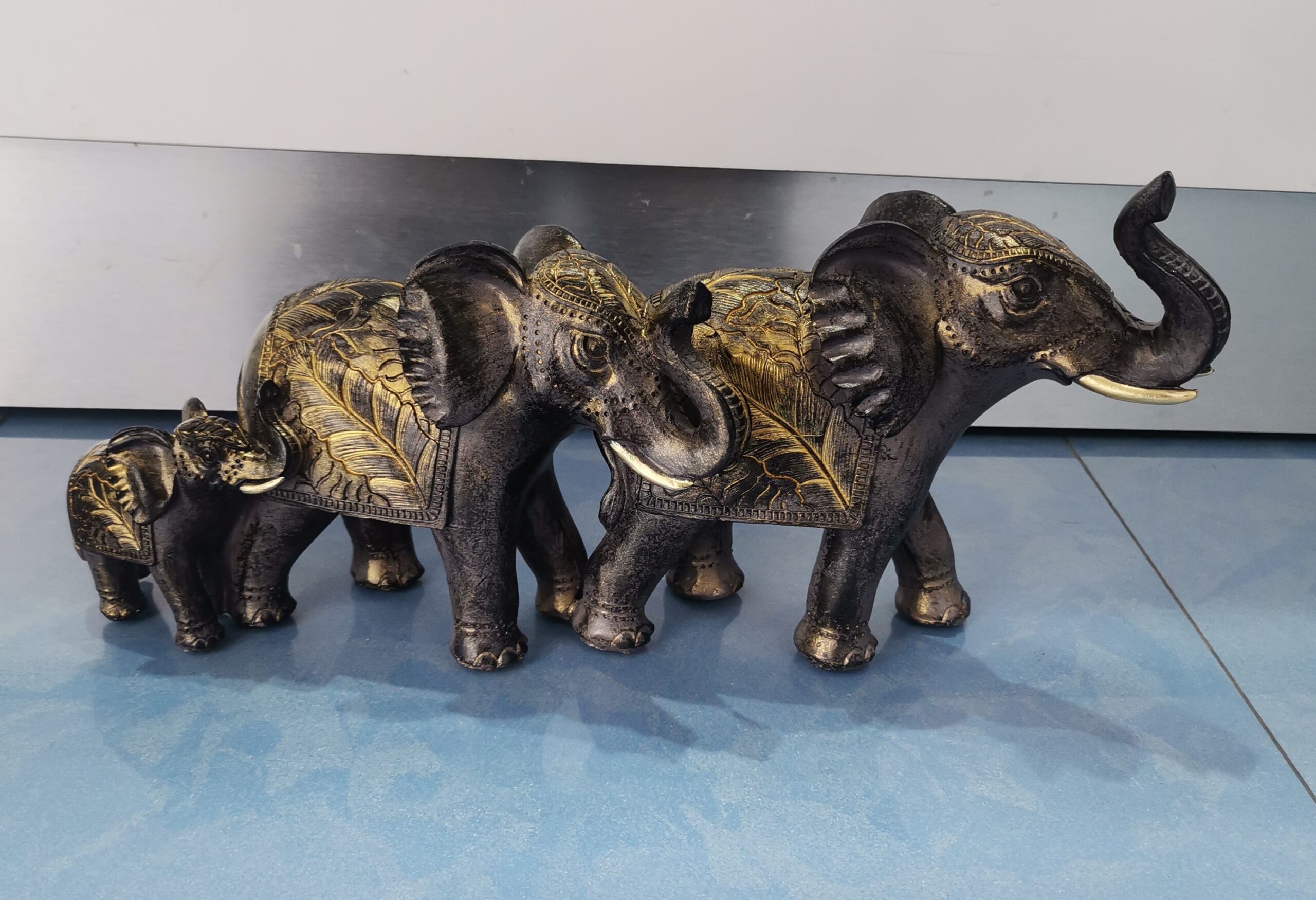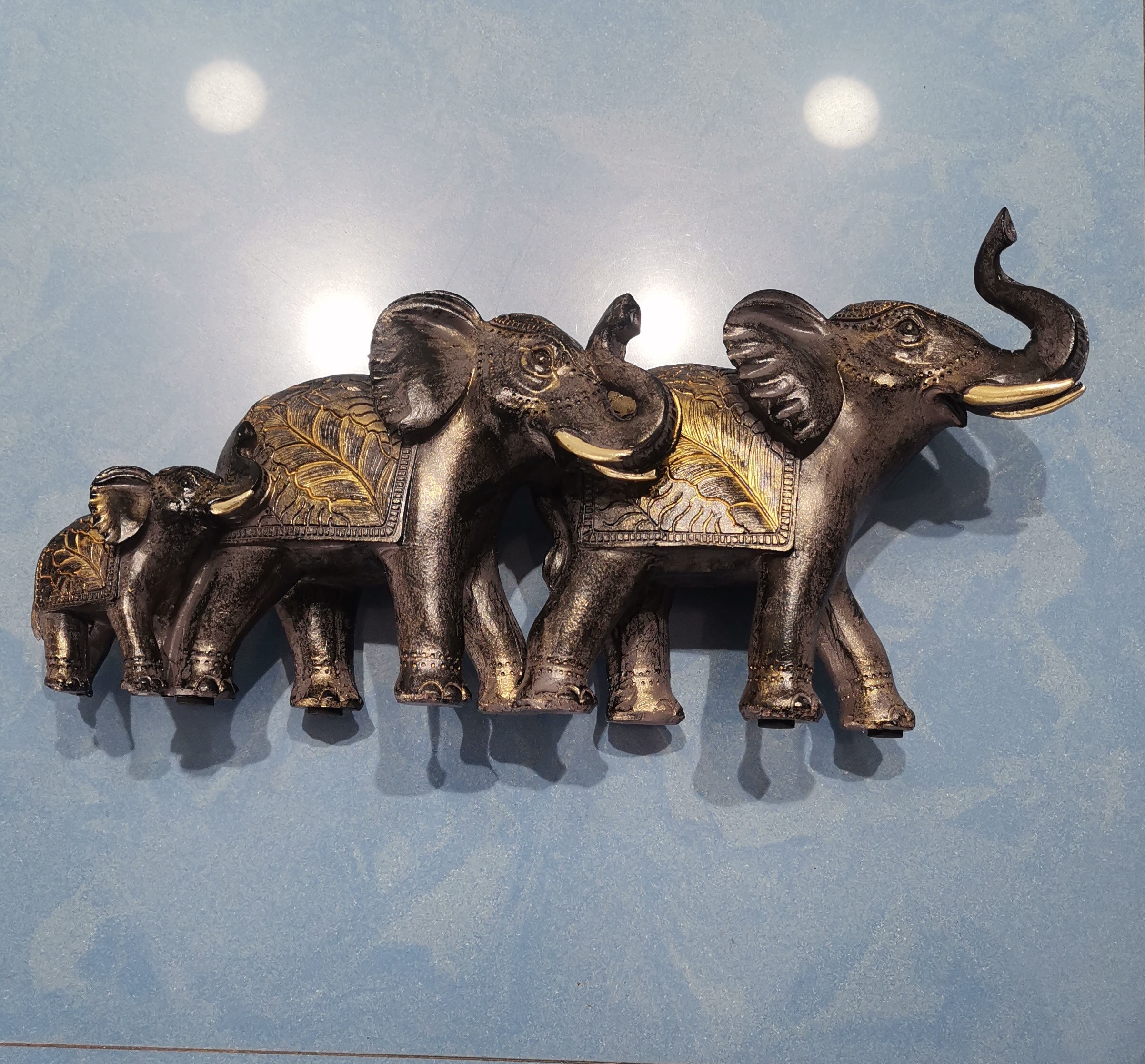 Figuras de elefantes de resina. Espectacular figura de decoración de resina de alta calidad. Excelentes detalles. Tamaño 29,50 centímetros de altura por 14,50 centímetros de altura. Esta figura lleva una familia de elefantes compuesta por tres elefantes de la suerte. Lleva por toda su figura grabados en mosaicos y en la parte superior lleva grabados en relieve en color dorado.Encontramos a una familia elefante con su cría unidas en la misma figura.