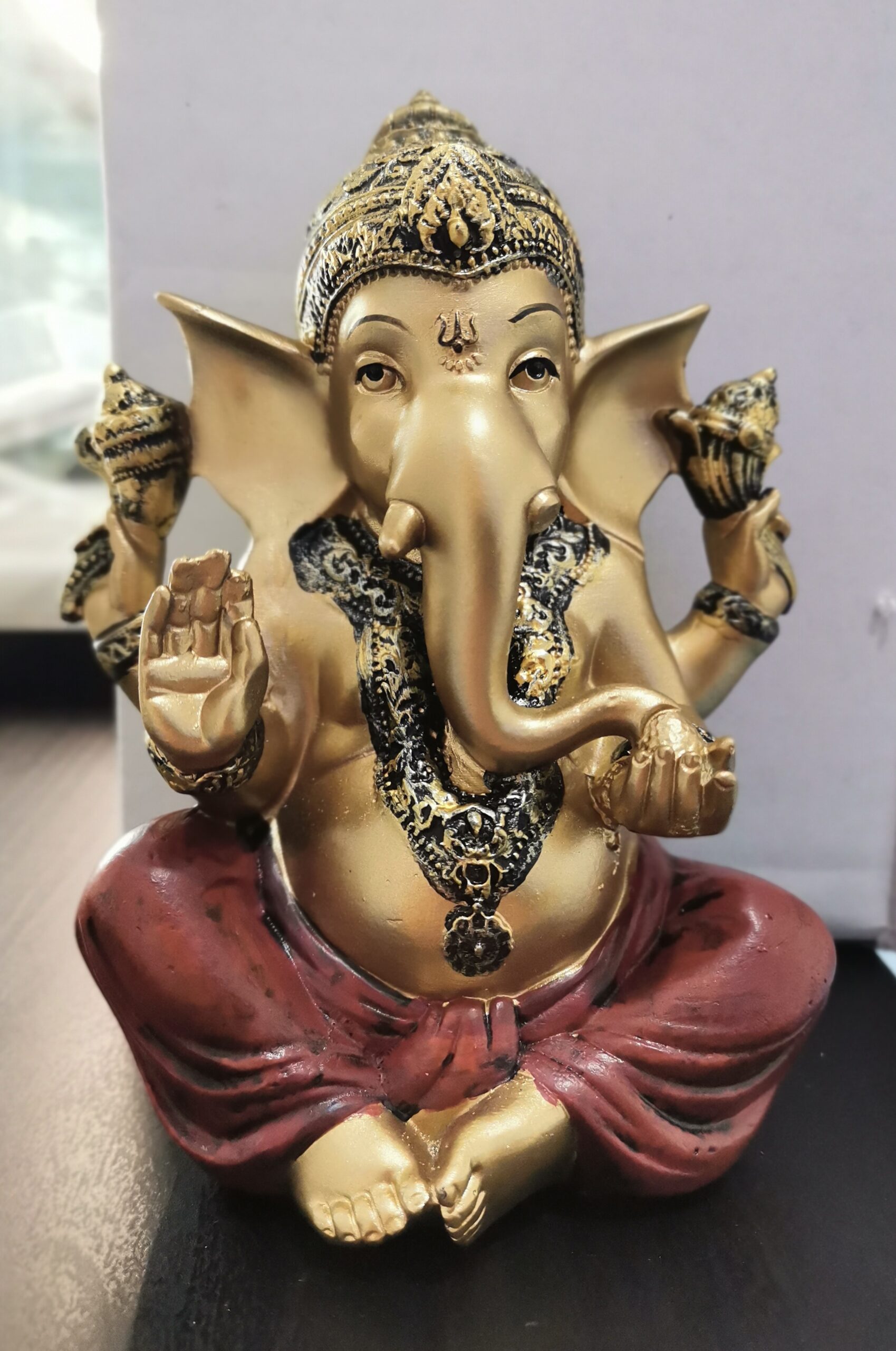 Figura de decoración de Ganesha. Figura de resina de gran calidad. Encontramos a Ganesha sentada en color cobre viejo y los pantalones son de color granate. Increíbles detalles y terminaciones. Ganesha es un Dios Hindú para la abundancia y abrecaminos. Tamaño 14,50 centímetros de altura por 11 centímetros de ancho.