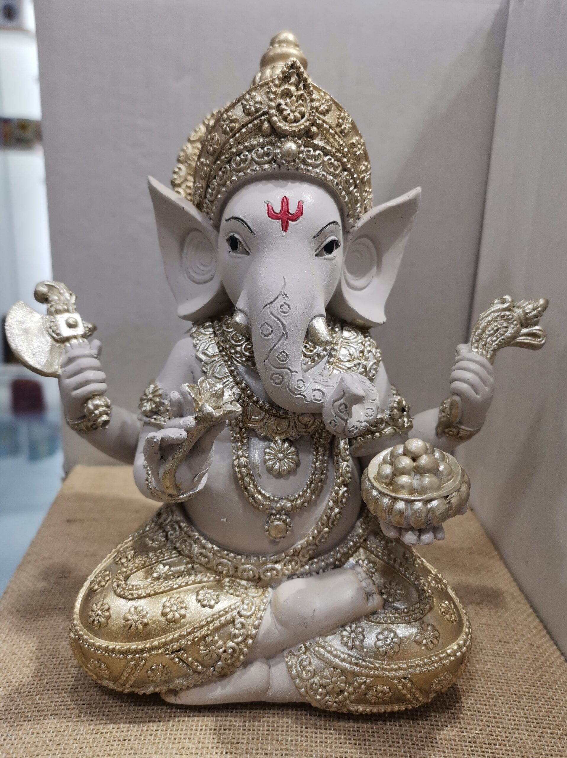 Figura de decoración en resina de Ganesha. Encontramos a Ganesha sentada y en sus manos lleva ofrendas. Ganesha es de color blanco mate y lleva la vestimenta, detalles, collares… en color dorado con purpurina y leves detalles en dorado. Tamaño de la figura 18 centímetros de altura, 16 centímetros de ancho y 12 centímetros de profundidad..