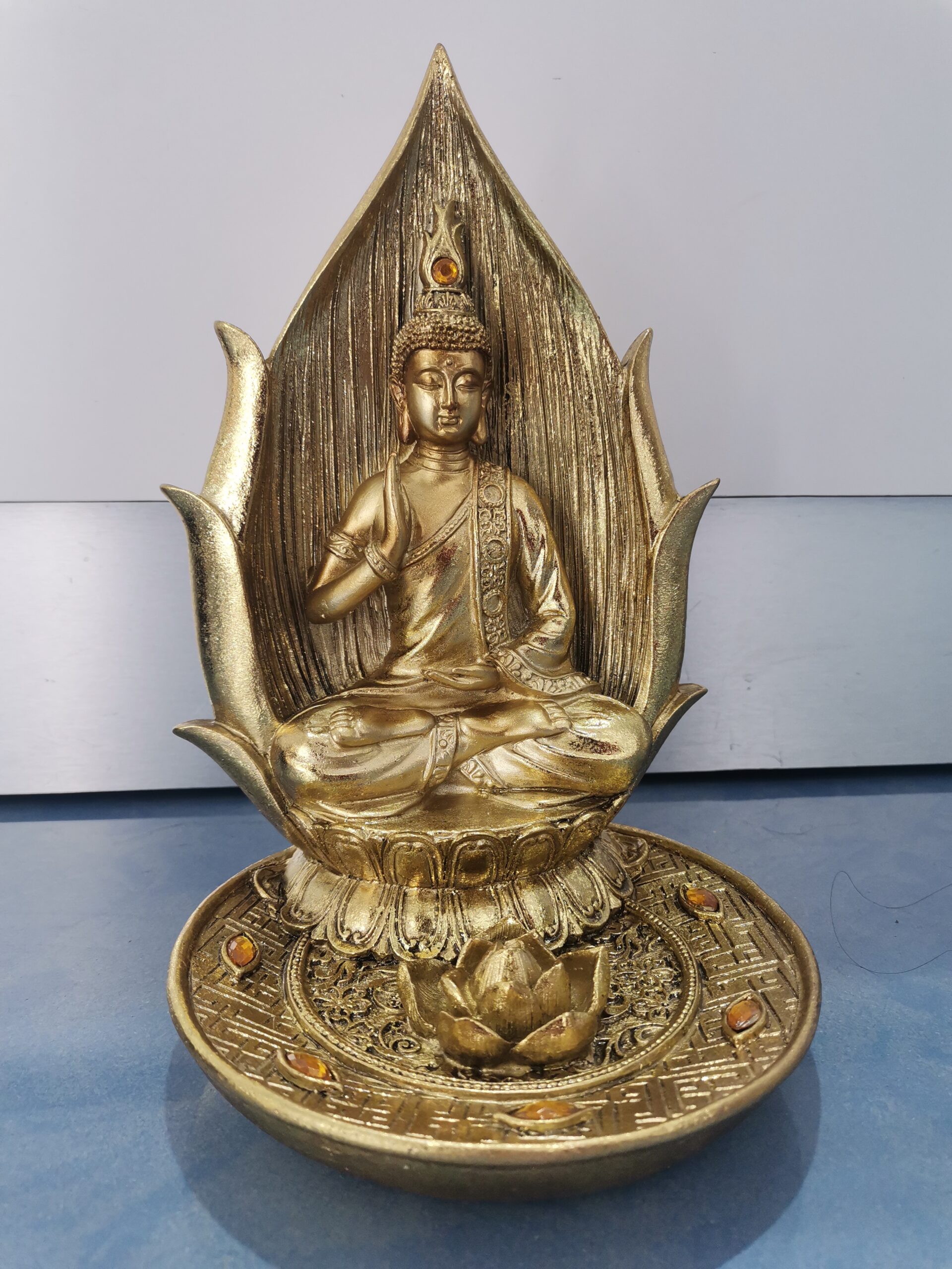 Incensario de resina. Incensario de decoración en color dorado. Encontramos un Budha de meditación sentado en un trono y en la base encontramos un plato con una flor de loto y decoraciones en imitación a piedra natural. Tamaño 22 centímetros de altura por 14 centímetros de ancho.
