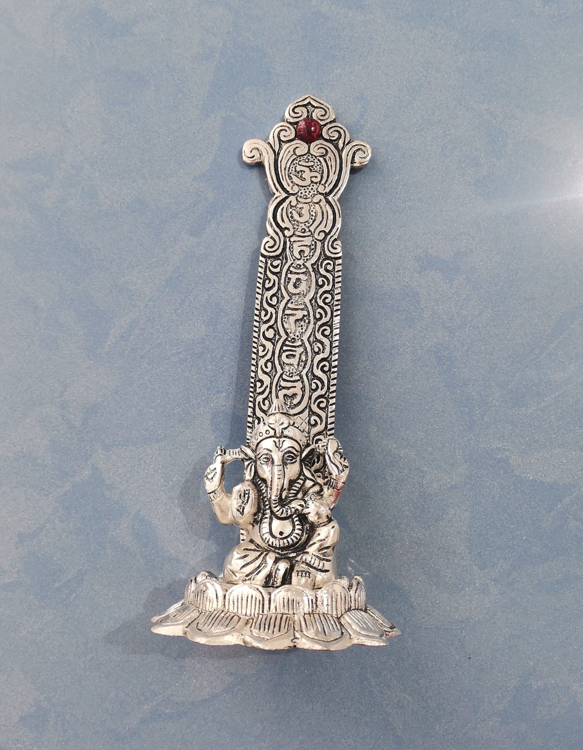 Incensario de aluminio con bonitas ilustraciones . Este incensario está hecho de aluminio y lleva en la parte central una Ganesha o un Budha y hacia arriba se eleva un poste con grabados y una imitación a mineral. Tiene dos orificios para poder poner dos inciensos al mismo tiempo. Tamaño 10 centímetros de ancho por 23 centímetros de altura.En caso de querer algún modelo , por favor especificar, de caso contrario se enviará según stock.