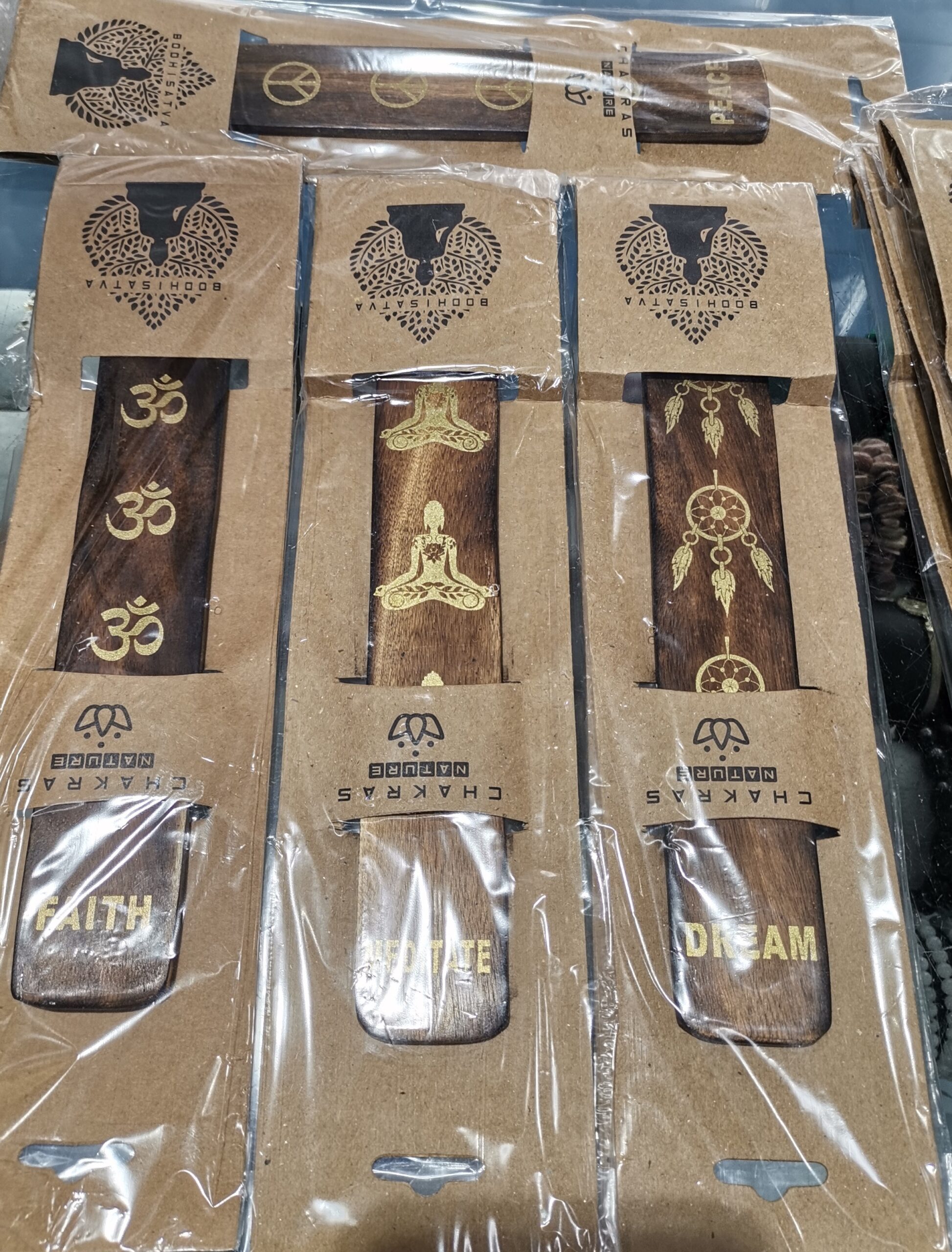 Incensario natural. Tablilla para incienso en stick de madera natural con diferentes dibujos en color dorado. Esta fantástica tablilla de incienso está disponible con diferentes diseños, Oms, Meditación, símbolo paz y Atrapasueños. Tamaño 26 centímetros de largo por 4 centímetros de ancho. En caso de querer alguno en concreto especificar, de caso contrario se enviará según stock.