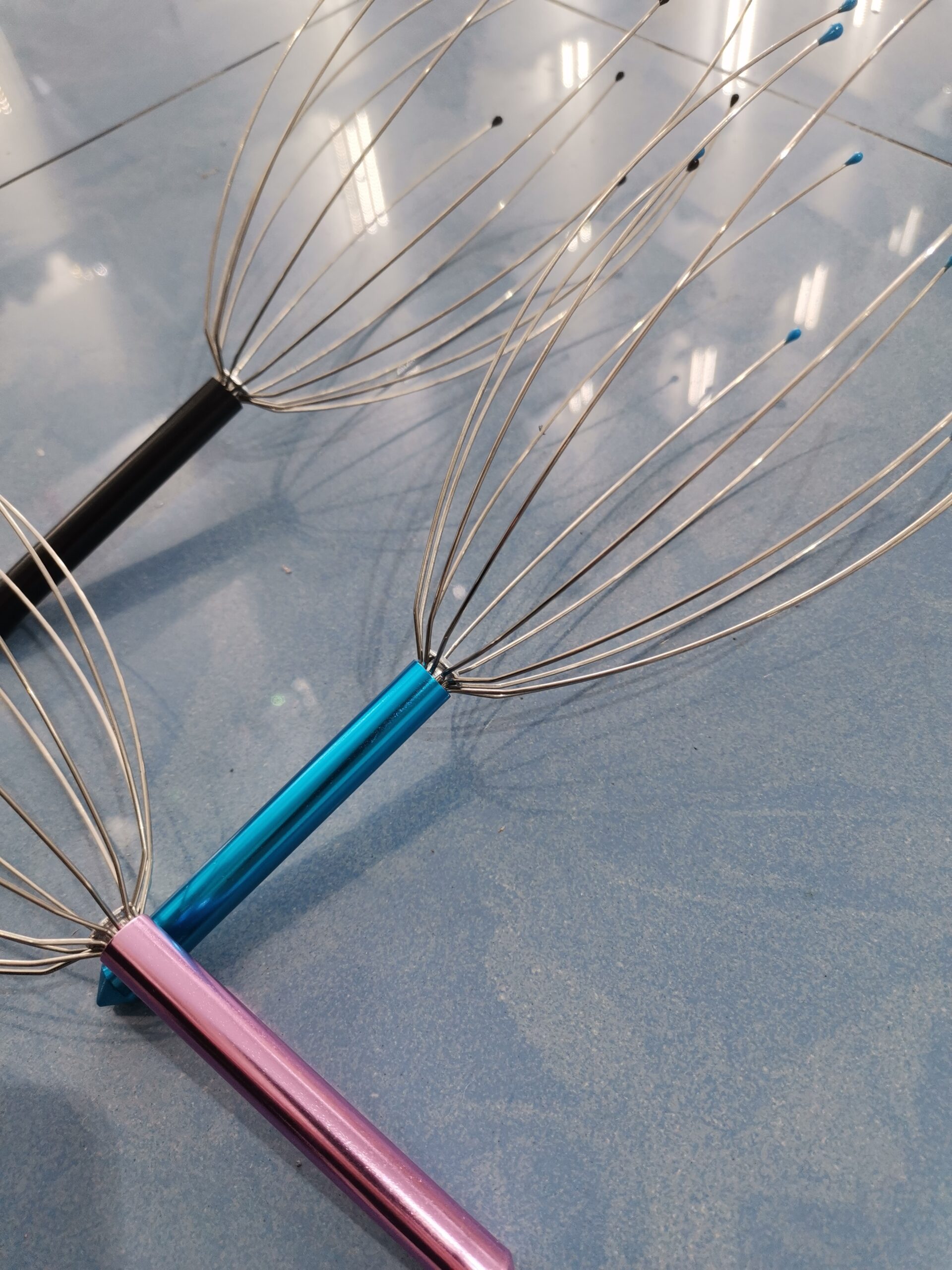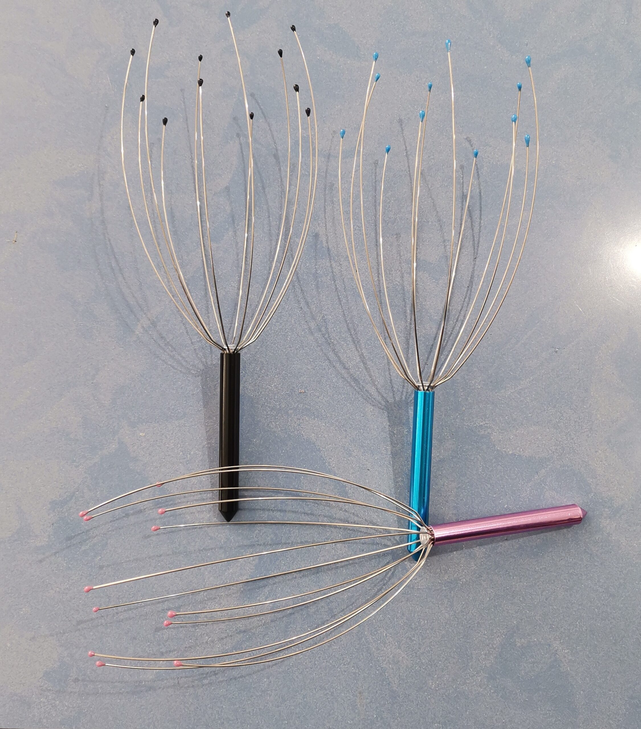 Masajeador para la cabeza. Este masajeador está hecho en aluminio y acero. Está disponible ne tres colores diferentes, azul, rosa y negro. Tamaño 25 centímetros. en caso de querer algún color en especial especificar, de caso contrario se enviará según stock.