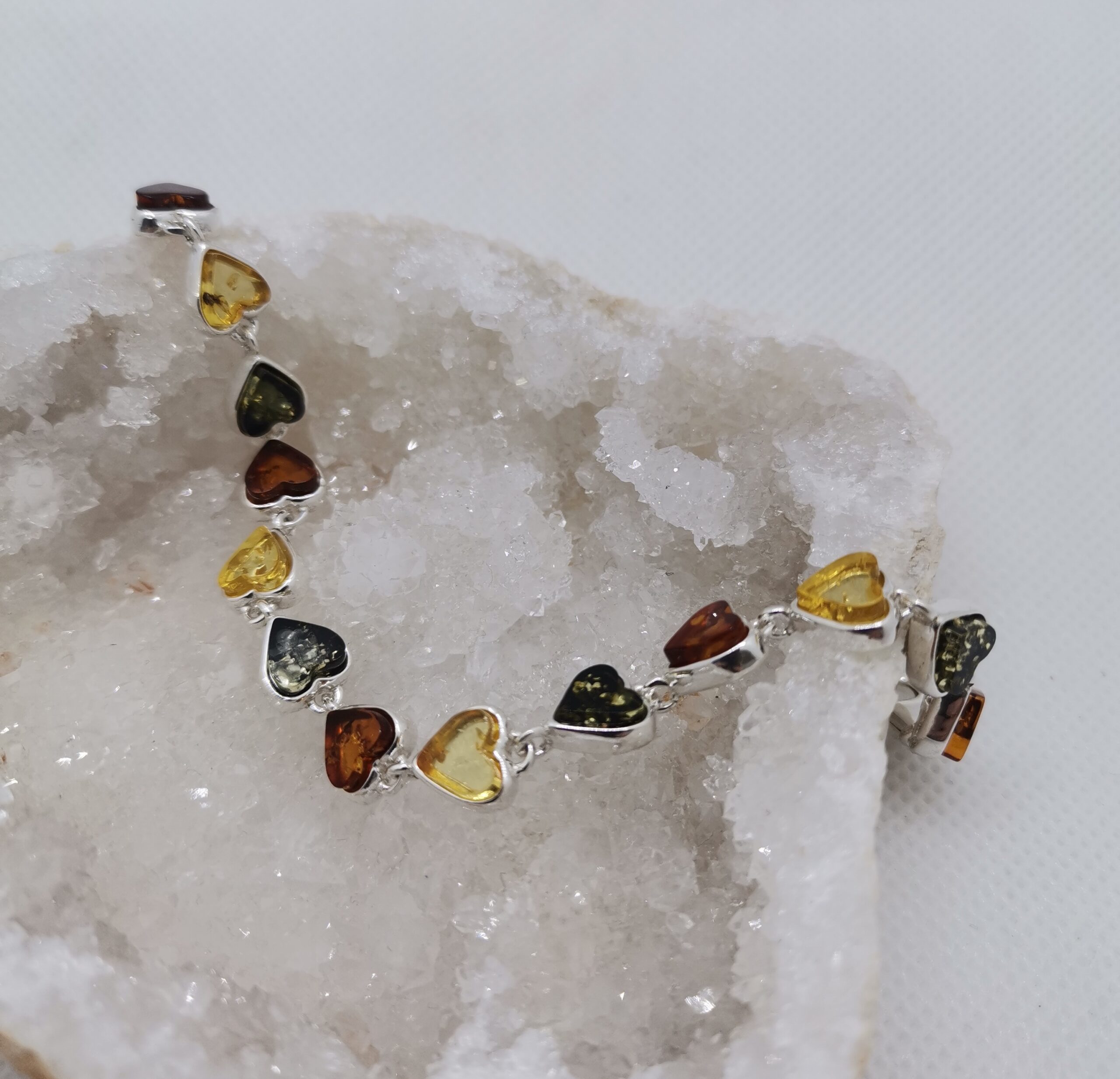 Pulsera de Ámbar y plata de ley. Procedencia del Ámbar Mar Báltico. Plata de ley 925. Encontramos 17 corazones de Ámbar y engarzadas a su alrededor por plata de ley . El Ámbar es en tres tonalidades diferentes. El cierre es de mosquetón. Tamaño de la pulsera 20 centímetros de diámetro. Lleva una cadena en plata para un mayor ajuste al tamaño de la muñeca.